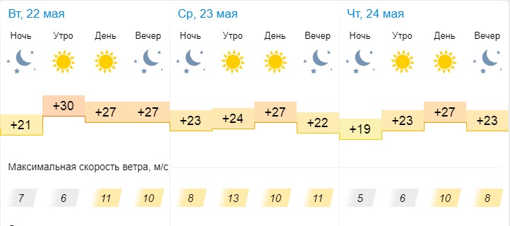 В среду, 23 мая, синоптики прогнозируют повышение температуры воздуха днем до +32°С, ночью до +27°С. Ветер 5-6 м/с.