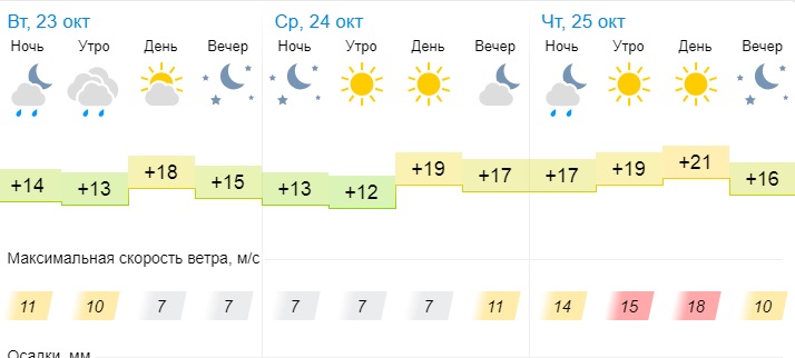 Дождь, по прогнозам синоптиков, ожидается сегодня, 23 октября. Средняя температура воздуха днём составит +18°С.