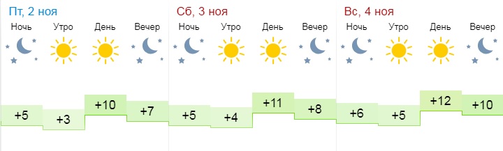 В субботу, 3 ноября, синоптики прогнозируют небольшую облачность. Температура воздуха днем составит +13°С, ночью +7°С. Ветер 6-10 м/с.
