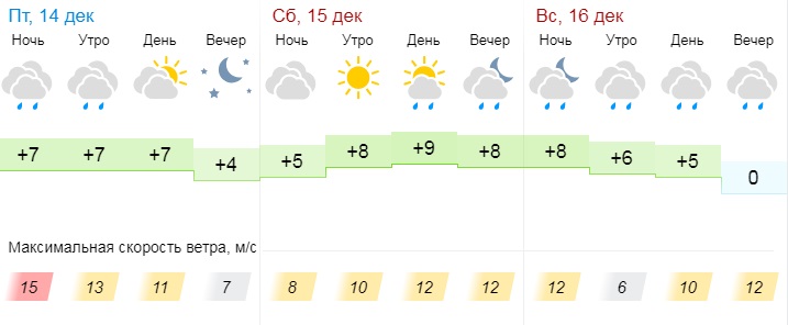 В субботу, 15 декабря, синоптики прогнозируют пасмурную погоду. Средняя температура воздуха днем составит +8°С, ночью +6°С. Ветер 5-12 м/с.