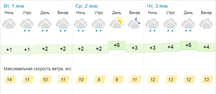 В среду, 2 января, синоптики прогнозируют облачную погоду. Средняя температура воздуха днем +3°С, ночью +2°С. Ветер 6-9 м/с.