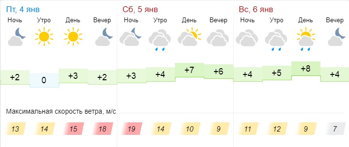 В субботу, 5 января, будет пасмурная погода. Ожидается небольшой дождь. Температура воздуха составит +7°С, ночью +6°С. Ветер 9-19 м/с.