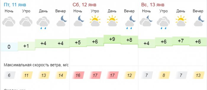 В пятницу, 11 января, по данным gismeteo.kz, синоптики прогнозируют пасмурную погоду, будет дождь. Температура воздуха днём составит +4°С, ночью +2°С. Ветер 6-14 м/с.