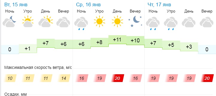В среду, 16 января, синоптики прогнозируют переменную облачность. Температура воздуха утром составит +11°С, ночью +9°С. Ветер 6-20 м/с.