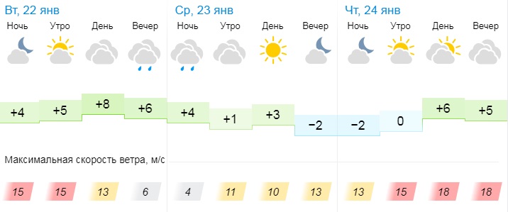 В четверг, 24 января, температура воздуха днём составит +6°С, ночью +5°С. Ветер 7-15 м/с.