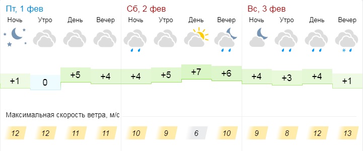 В субботу, 2 февраля, по данным синоптиков, будет облачная погода. Температура воздуха днем составит +7°С, ночью +6°С. Ветер 6-10 м/с.