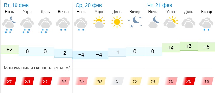 В четверг, 21 февраля, температура воздуха днём составит +6°С, ночью +3°С. Возможен дождь. Ветер 7-20 м/с.