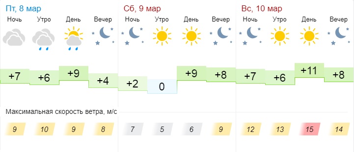 В воскресенье, 10 марта, температура воздуха днём составит +10°С, ночью +7°С. Ветер 7-17 м/с.