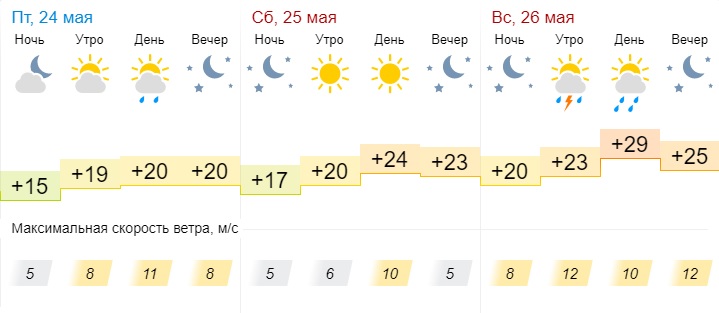 В воскресенье, 26 мая, по прогнозам синоптиков, будет пасмурная погода. Возможен дождь и гроза. Температура воздуха днём составит +29°С, ночью +25°С. Ветер 8-12 м/с.