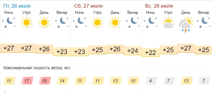 В воскресенье, 28 июля, по прогнозам синоптиков, будет пасмурно и дождь. Температура воздуха днём составит +27°С, ночью +25°С. Ветер 4-13 м/с.