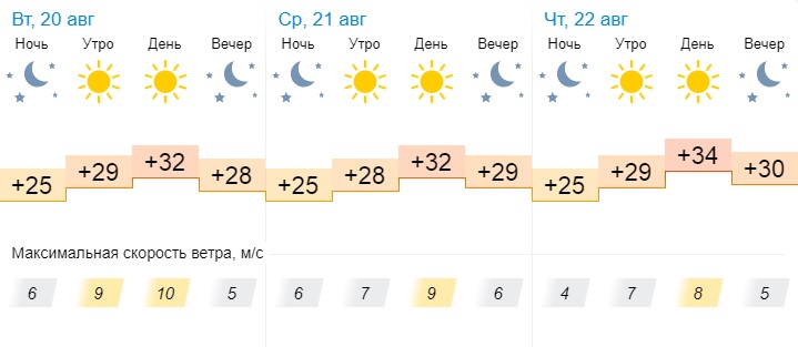 В четверг, 22 августа, по прогнозам синоптиков, будет вновь солнечно. Температура воздуха днём составит +34°С, ночью +30°С. Ветер 4-8 м/с.