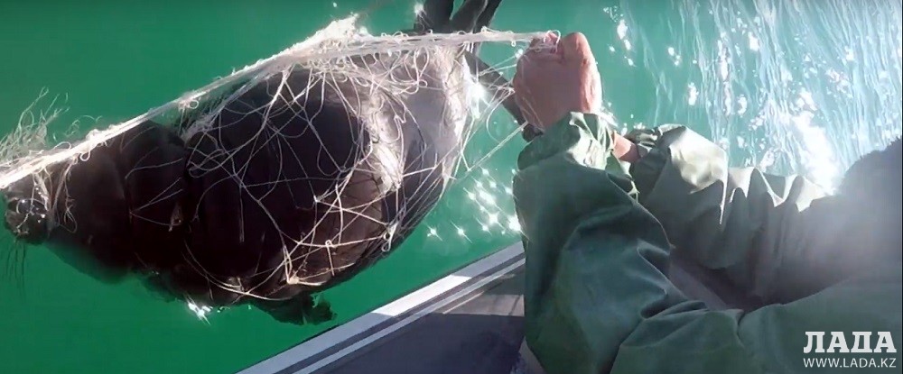 Работники Института гидробиологии и экологии засняли спасение каспийского тюленя из рыболовных сетей.