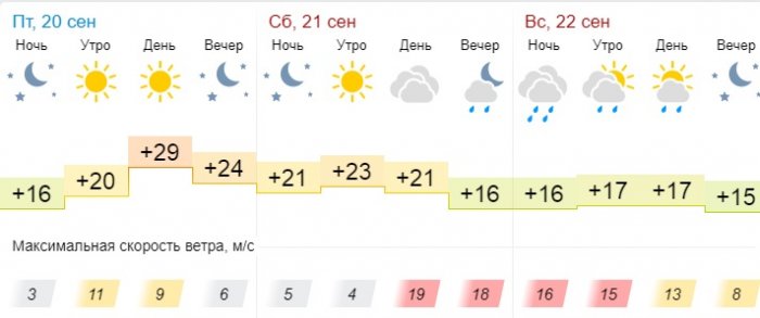 В воскресенье, 22 сентября, по прогнозам синоптиков, будет пасмурно и дождь. Температура воздуха днём составит +17°С, ночью +15°С. Ветер 8-16 м/с.