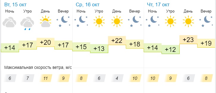 В четверг, 17 октября, по прогнозам синоптиков, будет ясно. Температура воздуха днём составит +23°С, ночью +19°С. Ветер 6-10 м/с.