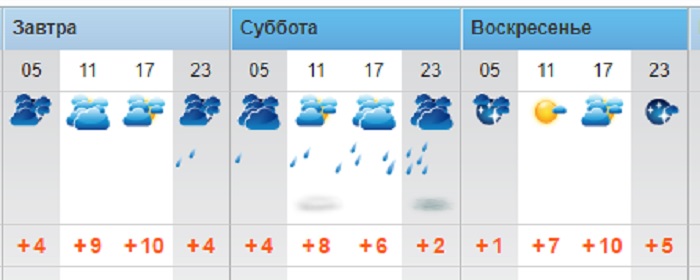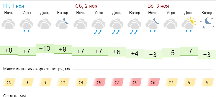В воскресенье, 3 ноября, по прогнозам синоптиков, будет облачная погода. Днем возможен дождь. Температура воздуха днём составит +7°С, ночью +3°С. Ветер 8-11 м/с.