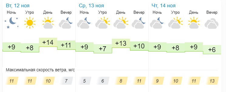 В четверг, 14 ноября, температура воздуха днём составит +10°С, ночью +4°С. Ветер 5-11 м/с.