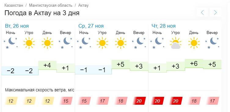 В четверг, 28 ноября, по прогнозам синоптиков, в Актау будет облачно с прояснениями. Средняя температура воздуха днём составит +7°С, ночью +3°С. Ветер 9-18 м/с. По данным gismeteo.kz, 26 ноября в Актау будет ясно. Температура воздуха составит +4°С днём, ночью +1°С. Ветер 12-15 м/с.