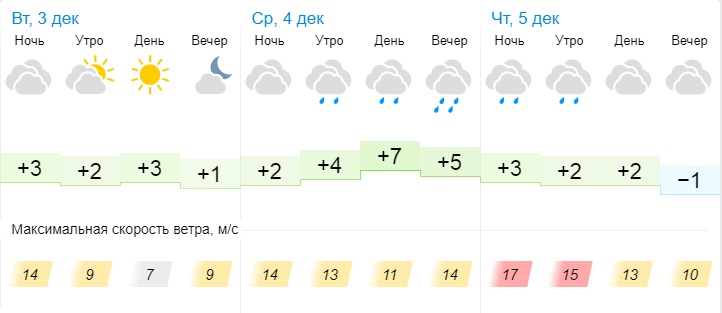 Во вторник, 3 декабря, по данным gismeteo.kz, синоптики прогнозируют облачную погоду. Температура воздуха днём составит +3°С, ночью +1°С. Ветер 7-14 м/с.