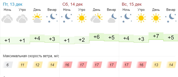 В субботу, 14 декабря, синоптики прогнозируют облачную погоду. Средняя температура воздуха днем составит +6°С, ночью +1°С. Ветер 9-16 м/с.