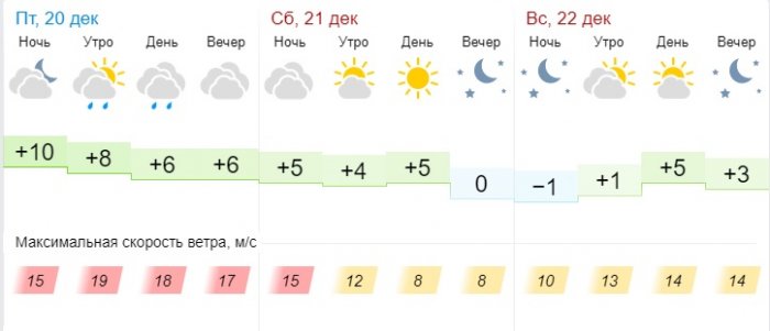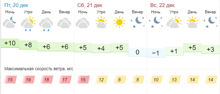 В воскресенье, 22 декабря, по прогнозам синоптиков, будет облачная погода. Температура воздуха днём составит +5°С, ночью +3°С. Ветер 10-14 м/с.