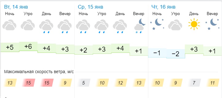 В среду, 15 января, в Актау будет пасмурно, и пройдёт небольшой дождь. Средняя температура воздуха днём составит +4°С, ночью +1°С. Ветер 5-13 м/с.