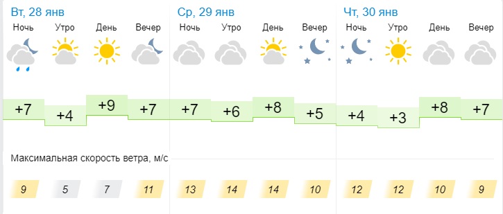 В четверг, 30 января, по прогнозам синоптиков, будет пасмурно. Температура воздуха днём составит +8°С, ночью +7°С. Ветер 9-12 м/с.