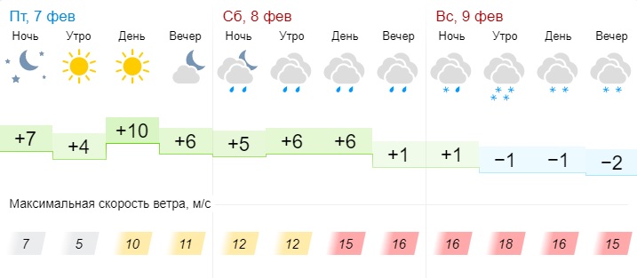 В воскресенье, 9 февраля, синоптики прогнозируют снег. Средняя температура воздуха днём составит -1°С, ночью -2°С. Ветер 15-18 м/с.