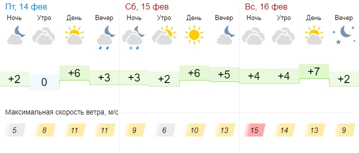 В субботу, 15 февраля, синоптики прогнозируют ясную погоду. Средняя температура воздуха днем составит +6°С, ночью +5°С. Ветер 6-13 м/с.