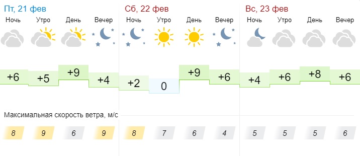 Днём 21 февраля воздух прогреется до +9°С. Суббота, по прогнозам синоптиков, будут солнечной.