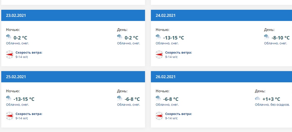Аналогичный прогноз предоставляет сайт gismeteo.kz. По данным источника, 24 февраля столбик термометра покажет 15°C ниже нуля. Осадки в виде снега прогнозируются с 23 по 26 февраля.
