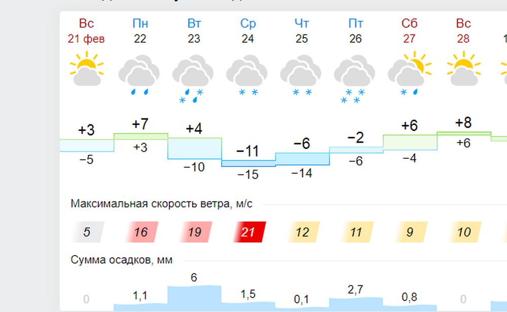 По информации сайта rp5.kz, плюсовая температура сменится морозами уже во вторник, 23 февраля. Вечером температура опустится до -11°C. На следующее утро, 24 февраля, синоптики прогнозируют -17°C с порывами ветра до 20 м/с. Ожидается снег. Морозы продержатся до пятницы.