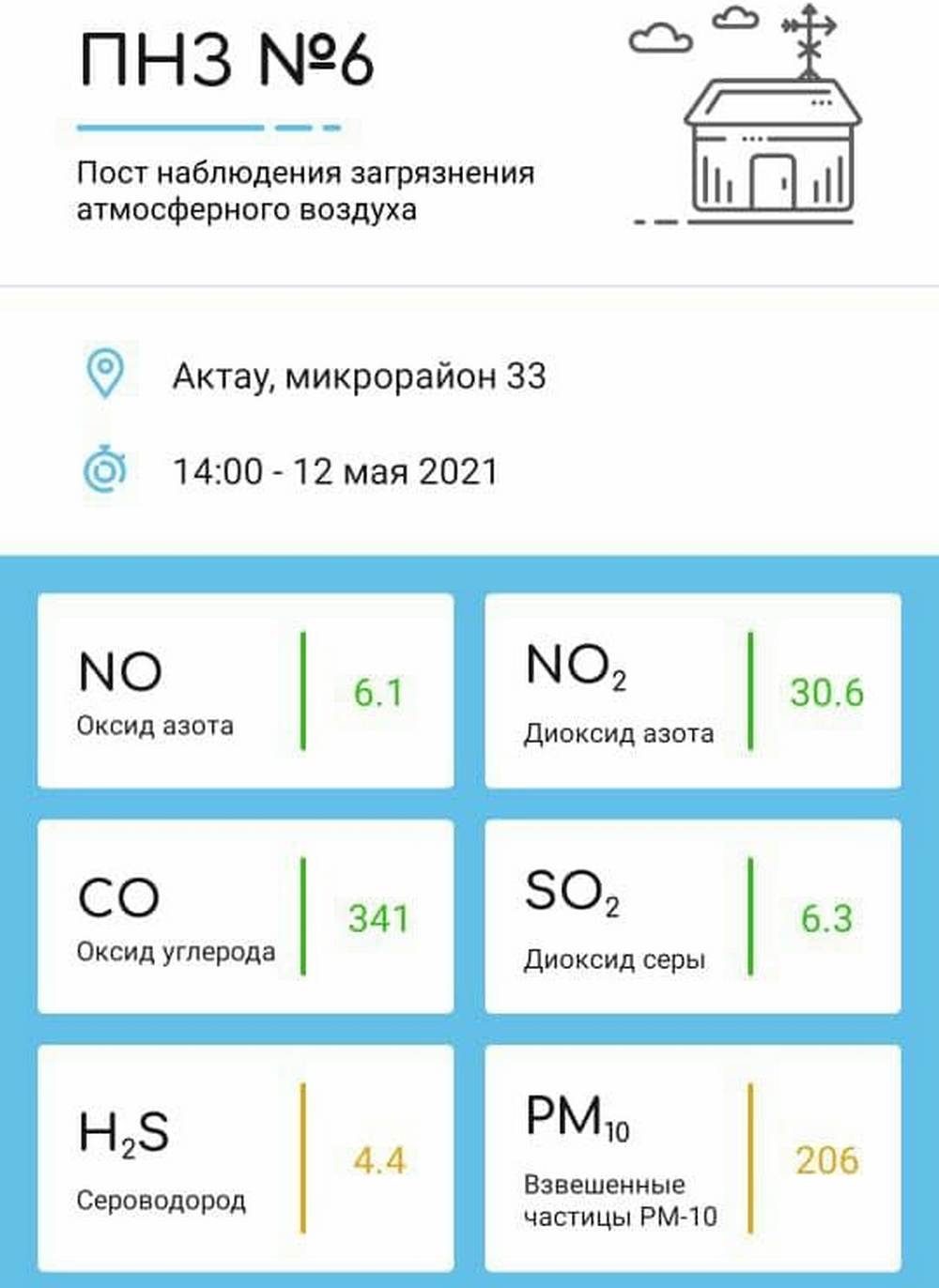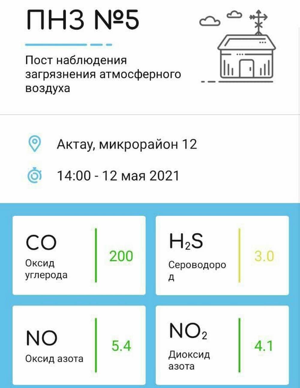 Тем временем в приложении «AirKz», которое отслеживает качество атмосферного воздуха на всей территории страны, показано, что в 33 микрорайоне содержание сероводорода на 14:00 составляло 4.4 мг/м3, а в 12 микрорайоне — 3.0 мг/м3.