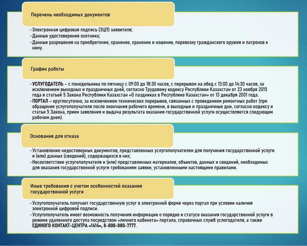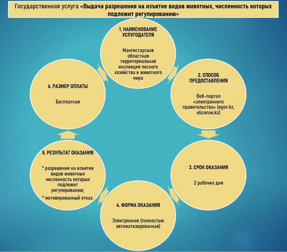 Более подробную информацию можно получить в информационно-правовой базе «Әділет» (приказ министра экологии, геологии и природных ресурсов Республики Казахстан № 347 «Об утверждении Правил оказания государственной услуги «Выдача разрешения на изъятие видов животных, численность которых подлежит регулированию» от 30 декабря 2020 года).