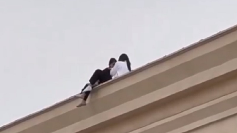 На кадрах видно, как две девушки, судя по всему, школьницы, сидят на крыше торгового дома, свесив ноги.