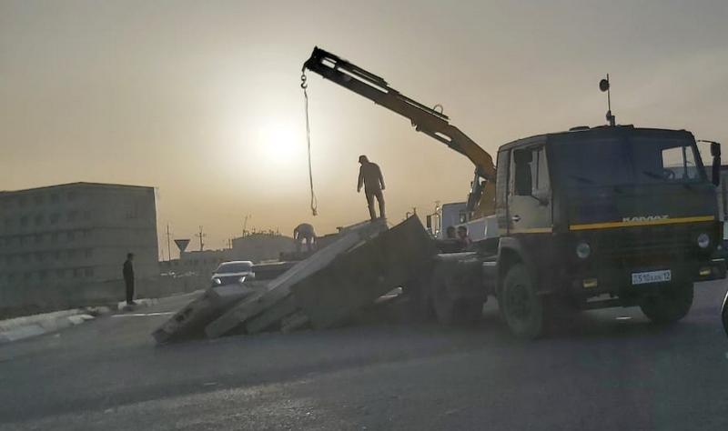 По словам очевидцев, стандартная пятиметровая железобетонная плита упала с «КамАЗа» на перекрестке. От этого большегруз накренился.