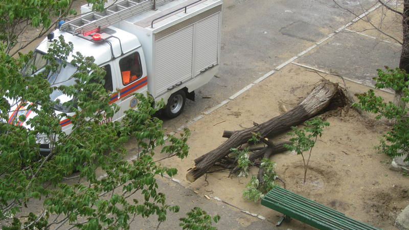Дерево полностью упало на дорогу после того, как спасатели убрали домкрат. С помощью ручной пилы они распилили дерево пополам. Верхнюю часть в итоге оставили за домом №36, нижнюю - перед подъездом дома №37.
