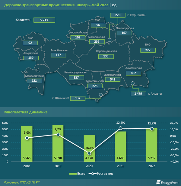 За этот же период в авариях по стране пострадали почти 7,7 тысяч человек, что на 11,9 процента больше по сравнению с январем-маем 2021 года. Из них раненых - 6,9 тысяч человек, на 10,9 процента больше по сравнению с аналогичным периодом прошлого года.