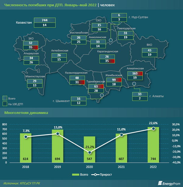 Численность погибших при ДТП в текущем году достигла 744 человека. Это самый высокий показатель с 2015 года в соответствующем периоде (январь-май). Показатель увеличился сразу на 22,6 процента, если сравнивать с 2021 годом.