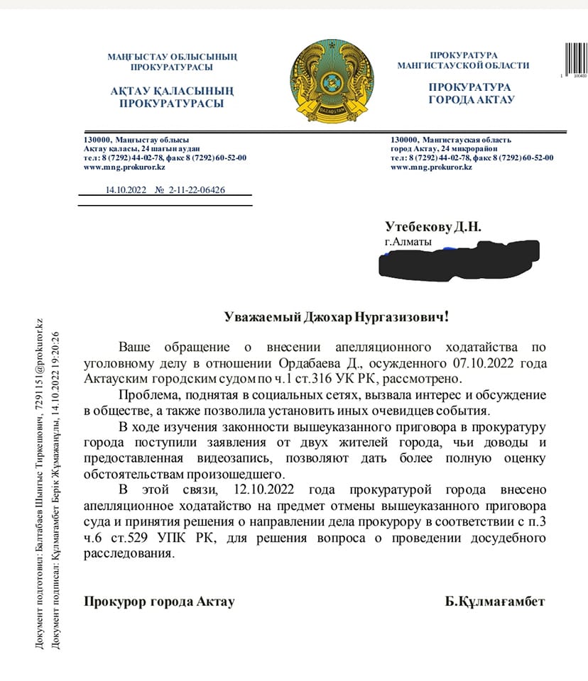 - Ура! Это победа зоозащиты и просто всех людей с сердцем! Нас всех шокировал садист, прыгнувший на котенка. Затем поразило его неадекватно мягкое наказание - 60 часов мести улицы. Я изучил приговор суда. Написал в прокуратуру о его незаконности. Так вот, прокурор Актау согласился со мной! Он подал апелляцию на приговор! Ребята, спасибо за поддержку! Мы добились своего! Злодей будет наказан по закону!