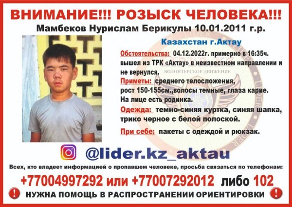 Сообщается, что 11-летний Нурислам Мамбеков вчера, 4 декабря, в 16:35 вышел из торгово-развлекательного центра «Актау» в неизвестном направлении и не вернулся.