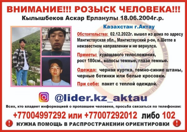 Как сообщается, 18-летний Аскар Кылышбеков 2 декабря вышел из своего дома в Шетпе и до сих пор не вернулся.