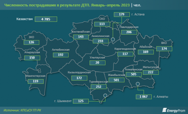 В региональном разрезе больше всего пострадавших от ДТП числилось в Алматы (1,1 тысяч человек). В Мангистауской области пострадали 119 человек. Меньше всего пострадавших зарегистрировано в Улытауской области - 20 человек.