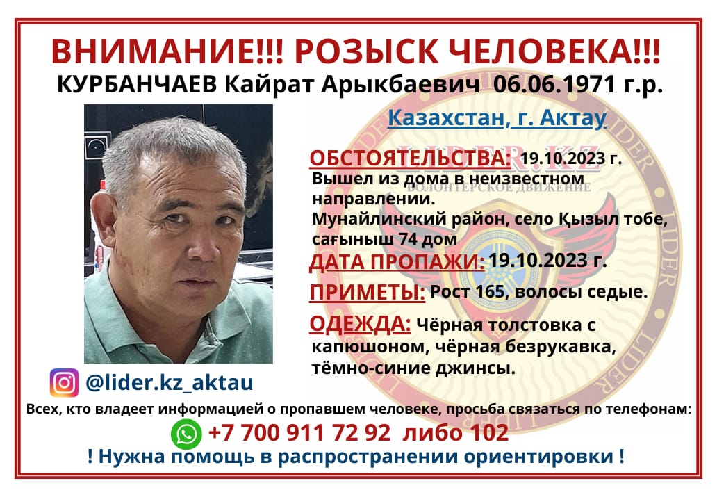 Волонтёры lider.kz и полиция разыскивают без вести пропавшего 52-летнего мужчину. Он вышел из дома 19 октября в селе Кызылтобе и по настоящее время его местонахождение неизвестно.