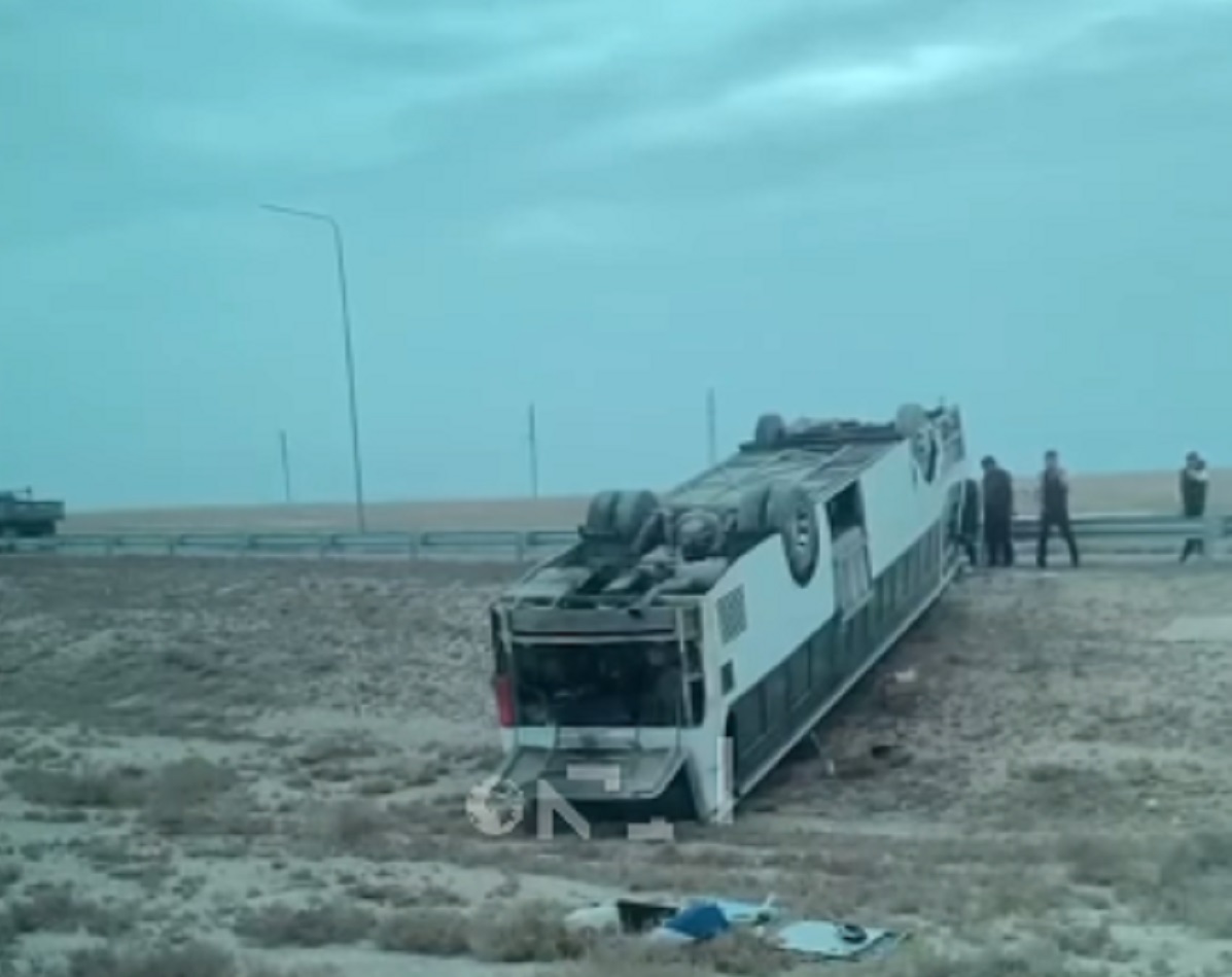 На трассе Актау – Жетыбай – Жанаозен перевернулся автобус. Кадры с места происшествия распространились в Сети. В пресс-службе департамента полиции по Мангистауской области прокомментировали инцидент.