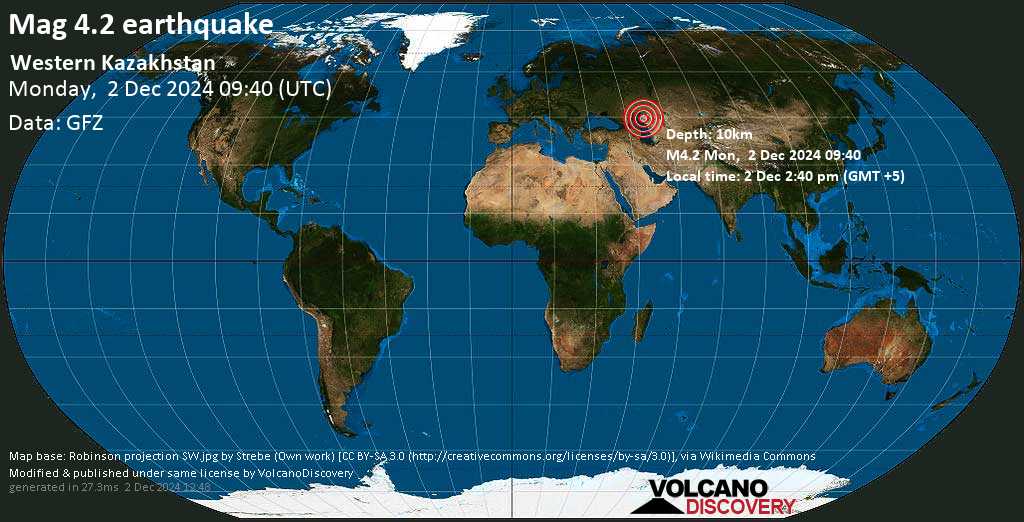 Сегодня, 2 декабря, в Мангистауской области ощущались толчки магнитудой 4.2, сообщает портал volcanodiscovery.com.