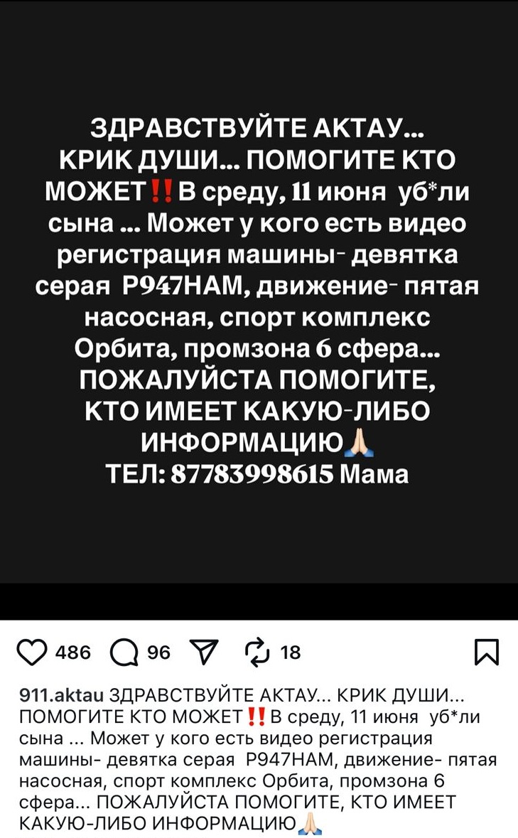 Сегодня, 15 июня, в местных Instagram-пабликах появилось обращение жительницы Актау с просьбой помочь установить обстоятельства гибели её сына.