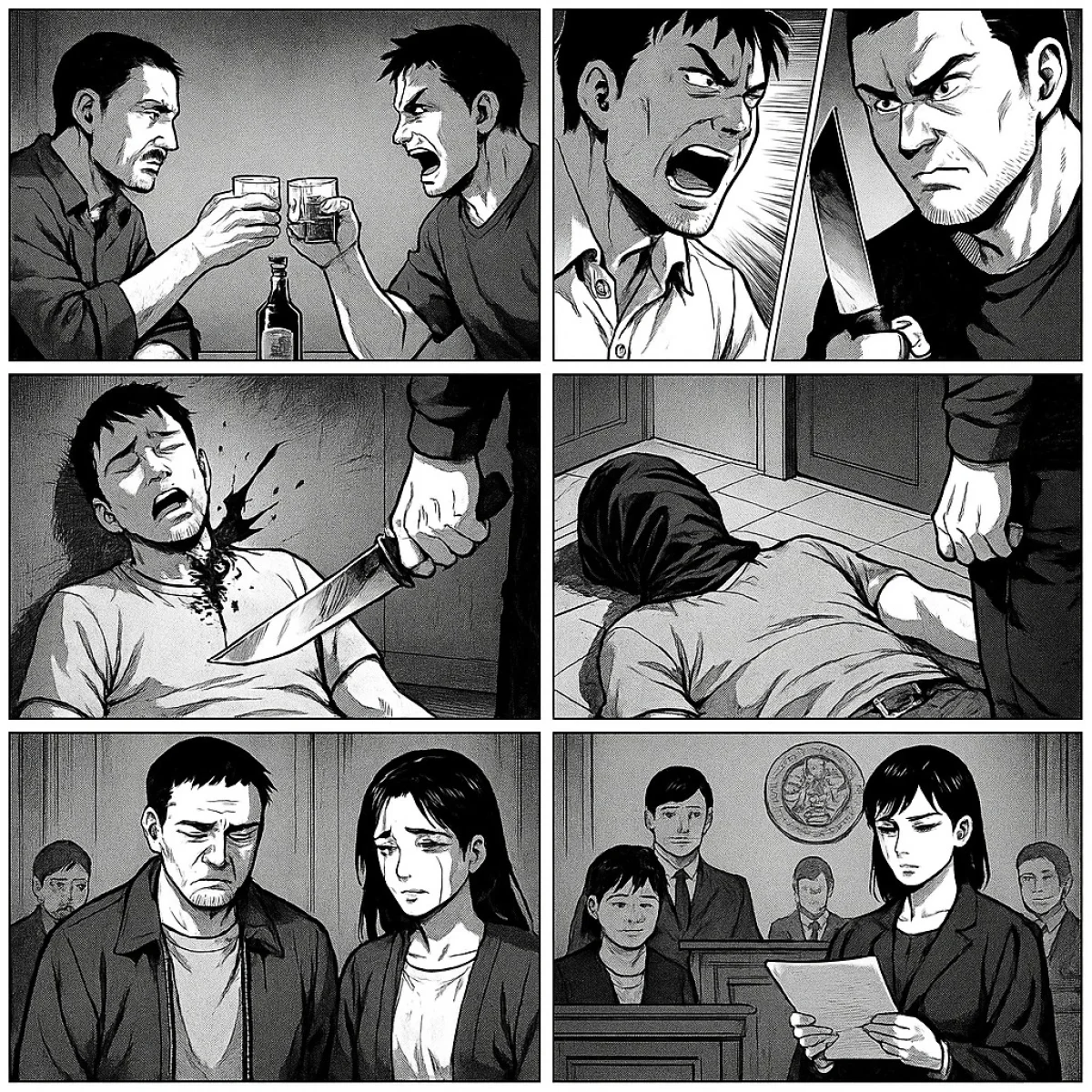Убийство случилось ночью 1 апреля 2025 года в доме подсудимого. В ходе активного возлияния с приятелем вспыхнула ссора, хозяин квартиры взял нож и нанес оппоненту удар в шею. Нож задел крупную артерию, что привело к обильному кровотечению. Потерпевший упал на пол и скончался на месте происшествия от потери крови.
