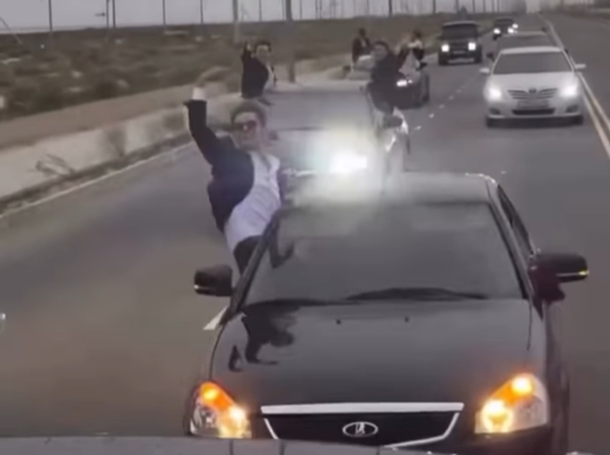 В Сети появилось видео опасной езды. На кадрах видео запечатлена группа молодых людей, ехавших на четырех автомобилях марки Toyota, Lexus, LADA Priora в сторону Тёплого пляжа. Они высовывались из окон автомобилей.