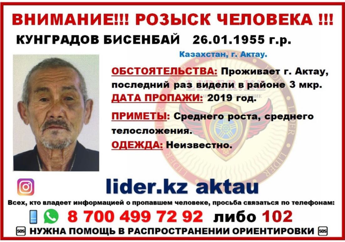 Бисенбай Кунградов, 1955 года рождения, житель Актау. Пропал в 2019 году. В последний раз его видели в районе 3 микрорайона.