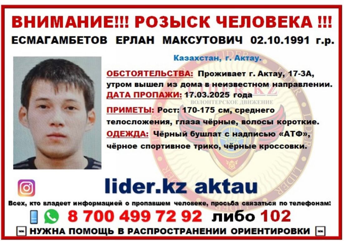 Ерлан Есмагамбетов 1991 года рождения. Пропал 17 марта 2025 года. Проживал по адресу: Актау, 17 микрорайон, дом №3А. Утром вышел из дома и не вернулся. Рост – 170-175 сантиметров, среднего телосложения, глаза чёрные, волосы короткие.